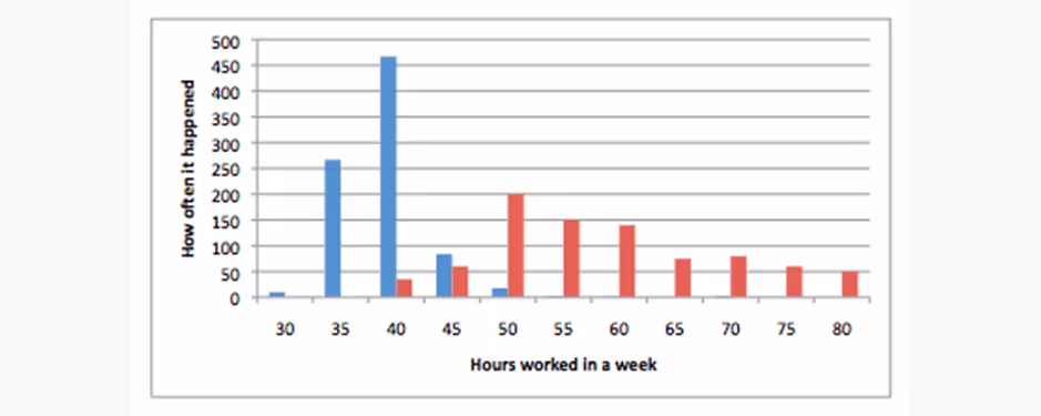 Consider the histogram below. The blue series shows developers that typically work 35-40 hours per week. There are very few weeks that the blue team has to work more than that, and they also seldom work less than that. The red team, on the other hand, has a much broader distribution of hours in a work week. They are as likely to work 80 hours as they are 45. The red team’s pace is not only less sustainable on a personal level, it’s a sign that their process or business practices lead to unpredictable work weeks.
