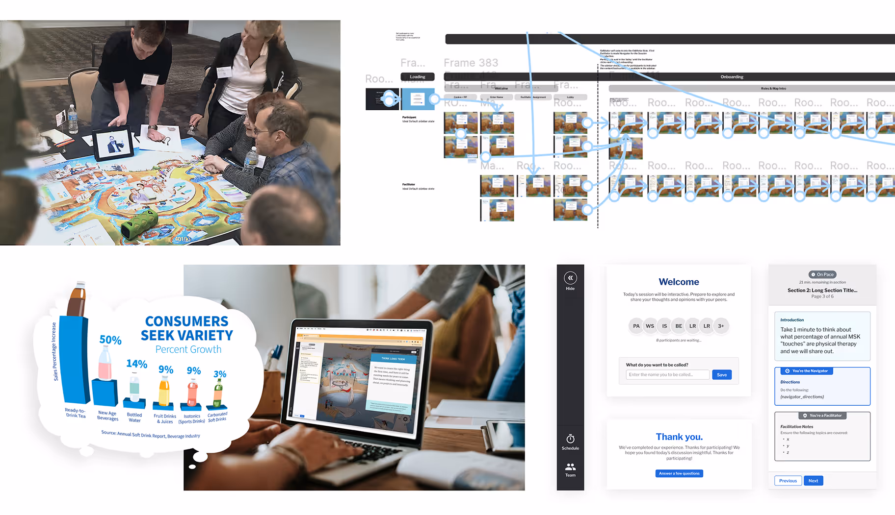 The Learning Map© platform enables multiple users to interact simultaneously with live cursor tracking, real-time responses, and drag-and-drop activities. These features preserve the collaborative essence of Root’s in-person workshops in a digital setting.